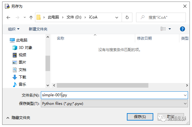 然后,点击 File→Save,起一个文件名,保存到电脑上,扩展名是.py,比如 Simple-001.py: