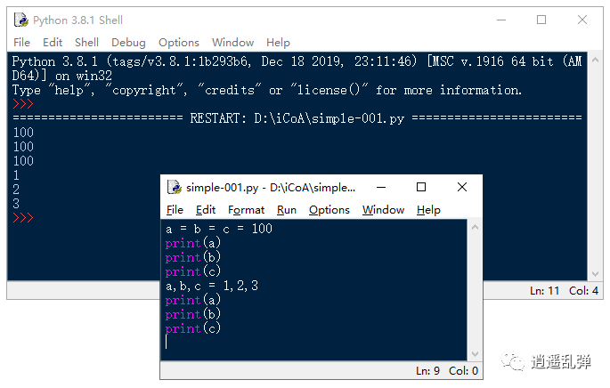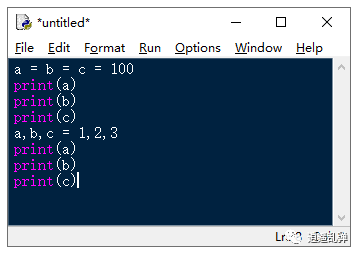 a = b = c = 100print(a)print(b)print(c)a,b,c = 1,2,3print(a)print(b)print(c)