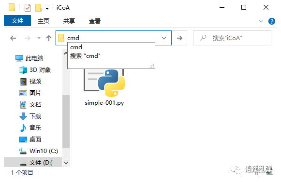 除了可以用 IDLE 运行 Python 程序之外,也可以用命令行,在保存 .py 程序的地址栏,输入 cmd 回车,会直接进入相关目录的命令行: